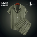 La **Selección Privada 'Cabo Norte'** está diseñada para el hombre moderno, combinando perfectamente la **ligereza veraniega** con una elegancia segura. Cada conjunto incluye una camisa de rayas de manga corta y un pantalón corto (shorts) ligero a juego, ambos bordados con el legendario jinete de R&L – el outfit de verano refinado por excelencia.